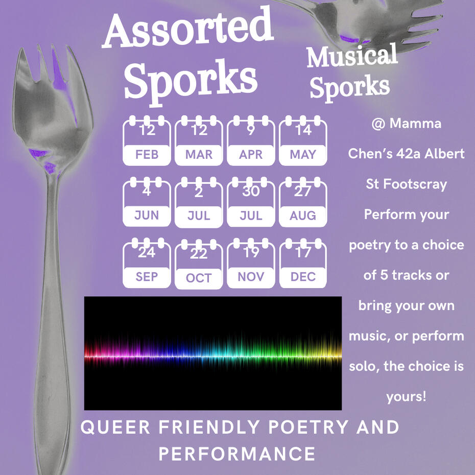 Musical Sporks, or Assorted Sporks with (optional) music is an event that will be happening every other fortnight all of 2026, alternating with the feature and themed nights, so basically, every 4 weeks, you will have a chance to try out performing your poetry to music.We have a menu of 5 backing tracks for you to choose from, Angry (also works well with stressed) Sad, Atmospheric, Beats, and Horny (is mildly spicy) all of the music is by George, AKA FluxOfHumour, you can also bring your own backing track, bring an instrument, or do something experimental.To have a listen to the music click here; https://www.soundclick.com/AssortedSporks/?content=songsIf you would rather perform with no music that is also fine, the open mic is still open for you to do whatever makes you comfortable. We will try out new backing tracks over time and are happy to get some feedback on moods and music you would like to pair your poetry to in the future.