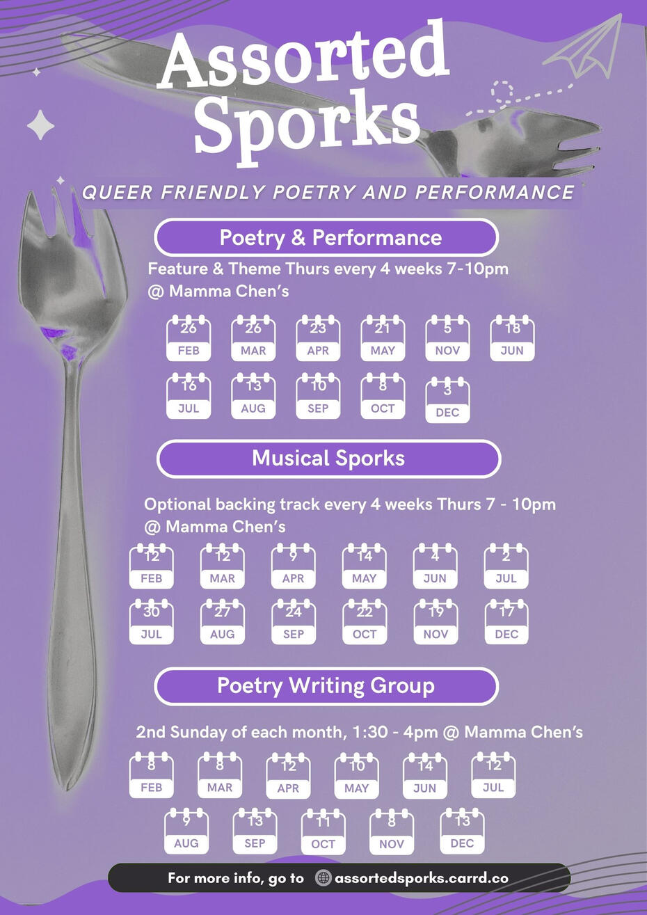 Assorted Sporks is a free, queer friendly poetry and performance night every 4 weeks (alternating fortnights with Musical Sporks) at Mamma Chen’s in Footscray (42a Albert St). Hosted by Me, Loran Steinberg. I do my best to feature queer and gender queer poets and amplify queer voices. Feature performances go for half an hour, and there is also an open mic on either side of the feature (five minute limit to the open mic slots).